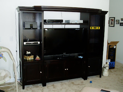 With our tax return in hand, I guess you could say we've gone on a bit of a tear here in the last month or so. It started with the entertainment center. Well, the entertainment center didn't arrive until 7pm one night. Ash was gone, so I had to deal with these nimrods for the next two hours by myself. Needless to say I saw enough plumber's crack to last a lifetime, and their solution to when something doesn't fit right: kick it or push it until it fits ("that's what she said"